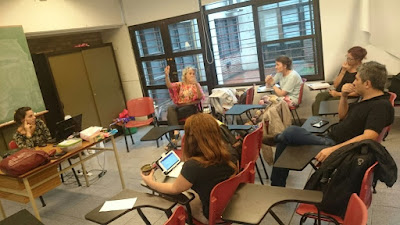 La plata baja del Área de Posgrado de la Facultad de Ciencia Política fue el lugar del encuentro donde Julia Dayub mostró, en un primer momento, los avances sobre el desarrollo de los manuales.