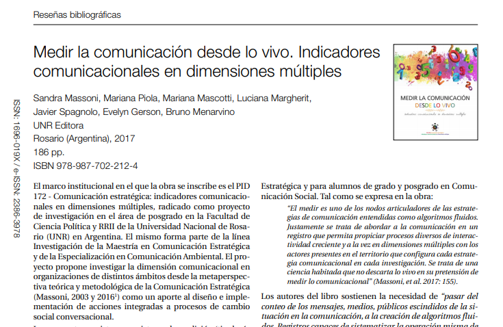 El PID Comunicación estratégica: indicadores comunicacionales en dimensiones múltiples radicado como proyecto de investigación en el área de posgrado en la Facultad de Ciencia Política y RRII de la Universidad Nacional de Rosario, forma parte de la línea de Investigación de la Maestría en Comunicación Estratégica. El proyecto propone investigar la dimensión comunicacional en organizaciones de distintos ámbitos desde la metaperspectiva teórica y metodológica de la Comunicación Estratégica (Massoni, 2003) como un aporte al diseño e implementación de acciones integradas a procesos de cambio social conversacional. La propuesta consiste en generar un sistema de medición (tipología de indicadores+plataforma on-line) que desde la Comunicación Estratégica permita valorar analíticamente el estado, avances y desarrollo de los procesos comunicacionales, considerando la fluidez y la complejidad del fenómeno en su multidimensionalidad. Este libro ofrece una recopilación de resultados y avances de la primera fase, principalmente compuesto por textos publicados en revistas científicas desde el año 2011 al 2015. La continuidad de los desafíos planteados se están desarrollando en la segunda fase del proyecto, actualmente en marcha.